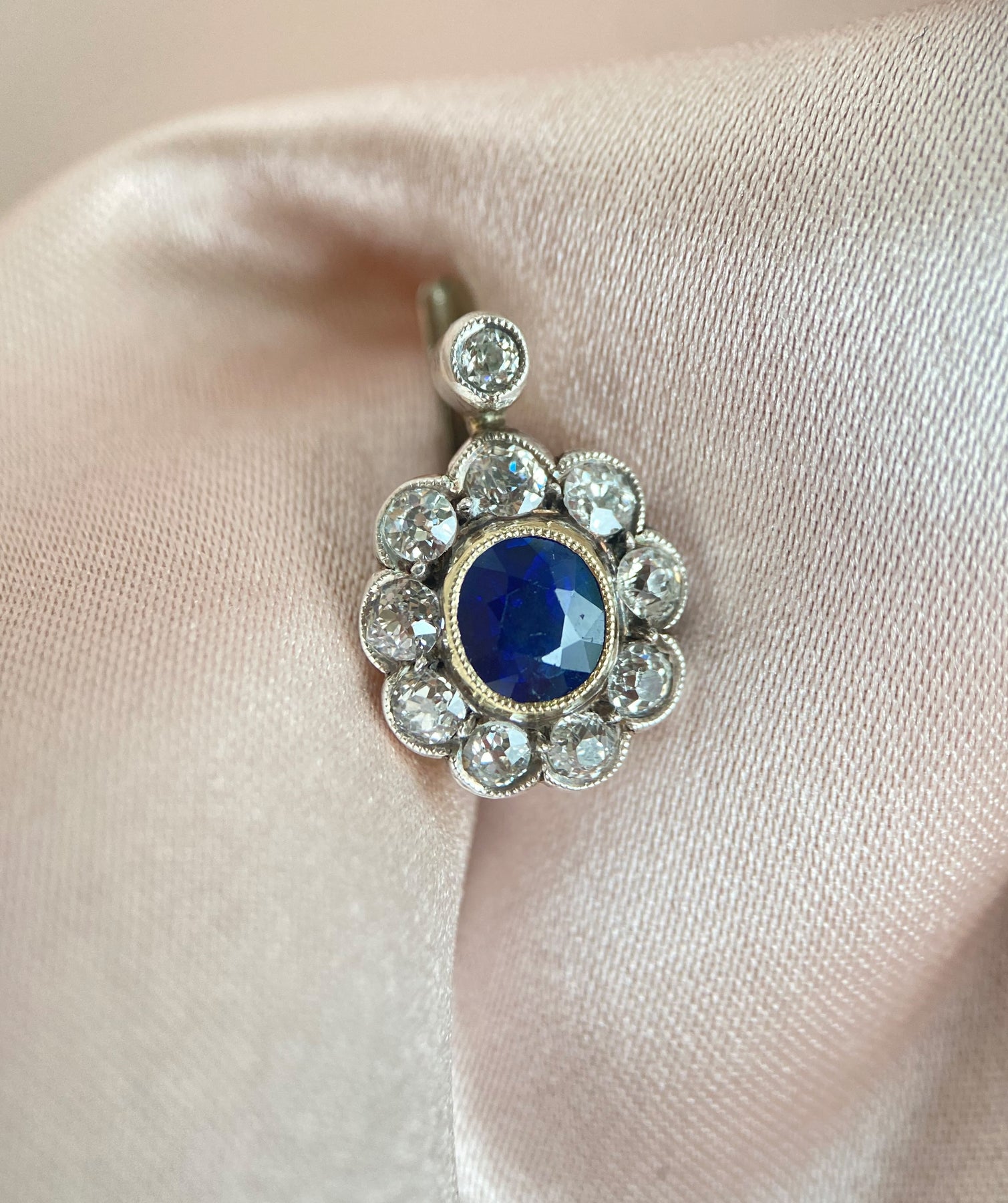 Jeder Ohrring ist mit einem dunkelblauen Saphir im facettierten ovalen Schliff von insgesamt ca. 2,10 Karat in einer Zargenfassung geschmückt. Die Saphire zeigen Anzeichen einer Erhitzung und strahlen mit tiefem, intensivem Blau. Umrahmt werden die Saphire von 20 Altschliffdiamanten, die zusammen ca. 1,80 Karat wie funkelnde Akzente setzen. Die Diamanten sind in präzisen Körnerfassungen gehalten und weisen einen mittleren Farbgrad sowie einen mittleren bis niedrigen Reinheitsgrad auf. Einige der Diamanten zeigen Oberflächenmerkmale.