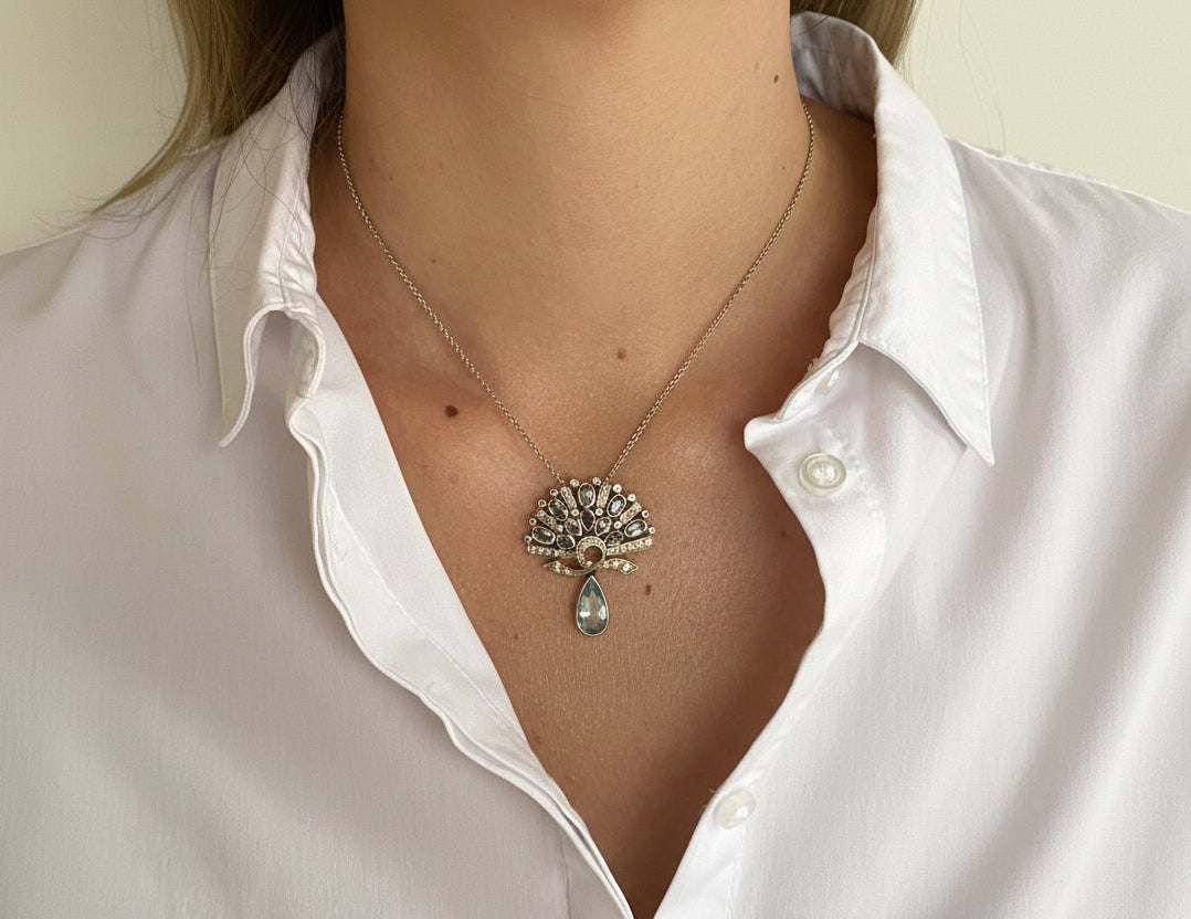 Tragefoto: Aquamarin‑Anhänger mit Diamanten an Weißgoldkette getragen, zeigt Wirkung am Hals getragen