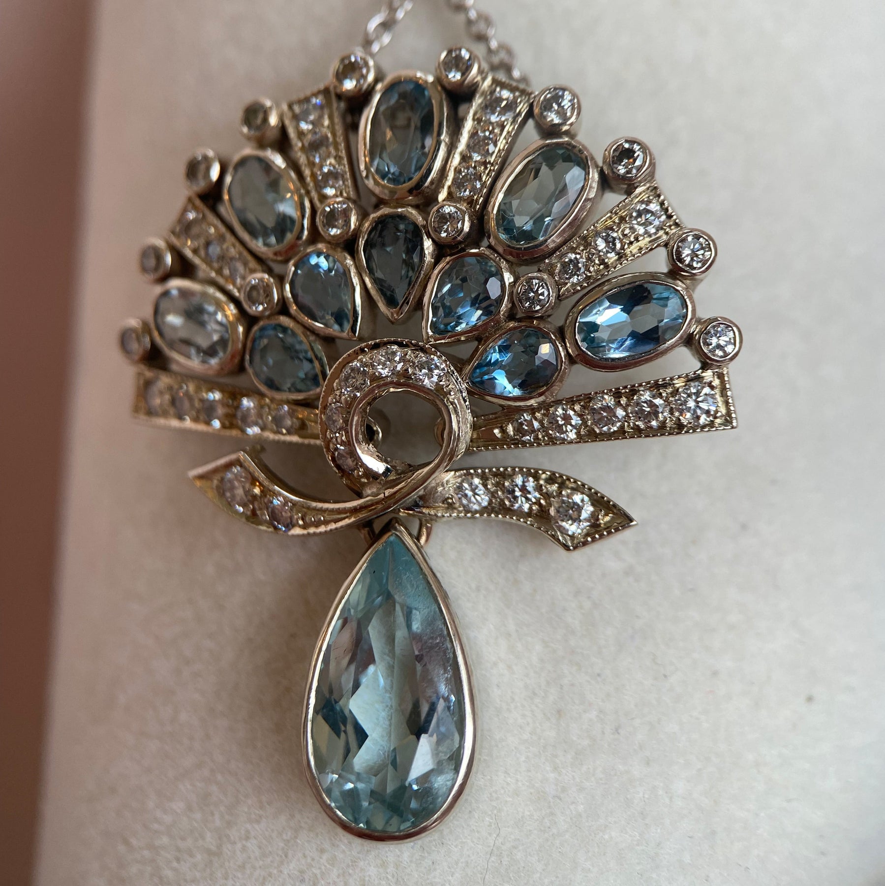 Weitere Perspektive des Anhängers mit Aquamarinen und Diamanten, detailreiche Produktansicht