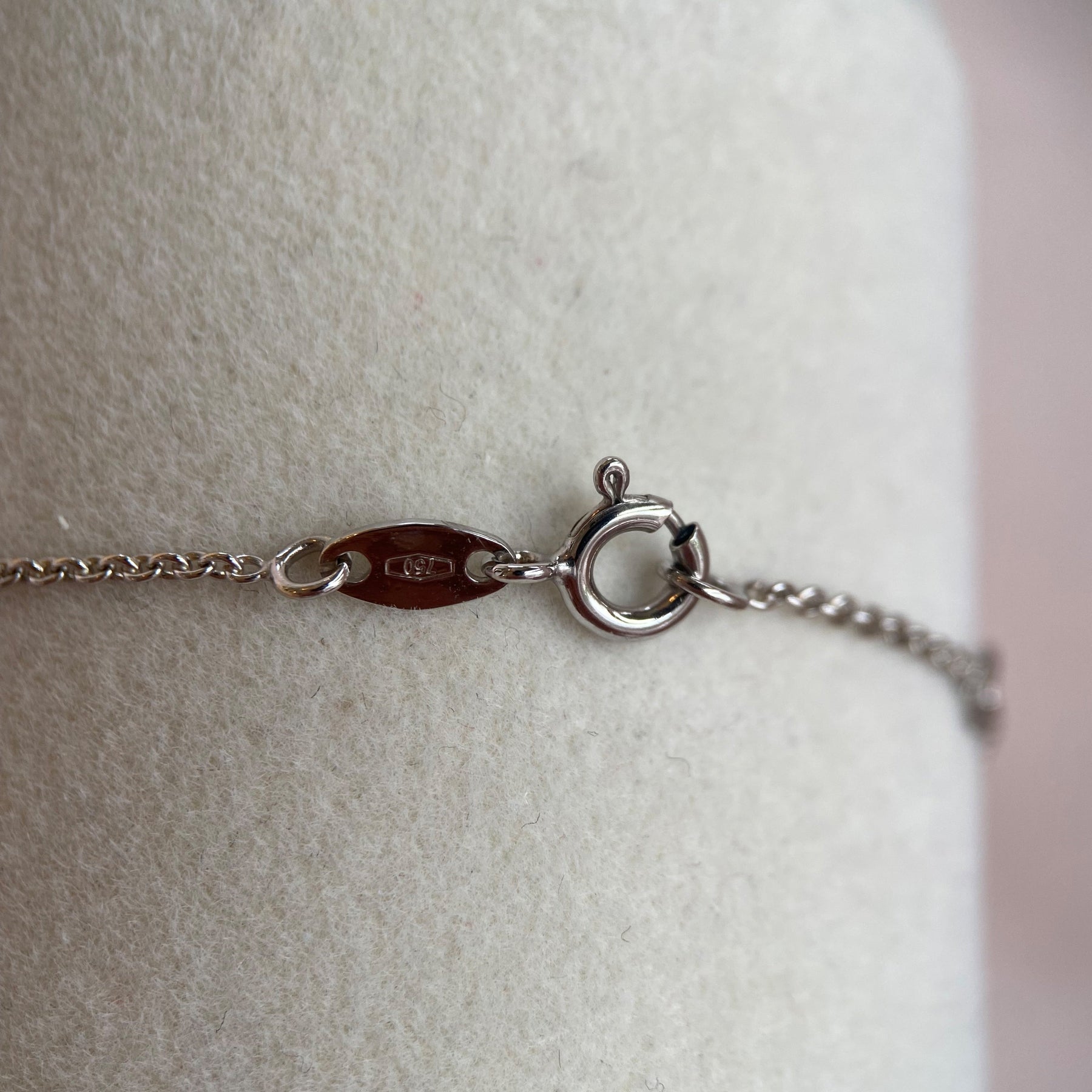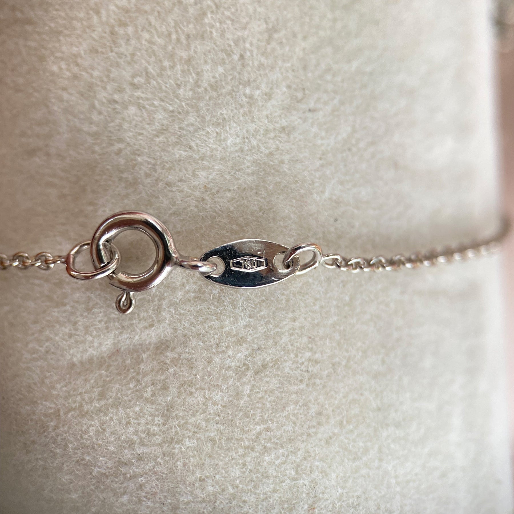 Die Halskette aus Weißgold 750 ist ein Erzeugnis der Gegenwart und repräsentiert die moderne Schmuckkunst mit ihrem Fokus auf schlichte Eleganz und hochwertige Materialien. Mit einem Gesamtgewicht von 2,49 Gramm ist sie leicht und angenehm zu tragen. Der Stempel „750“ bestätigt den hohen Goldgehalt von 18 Karat.