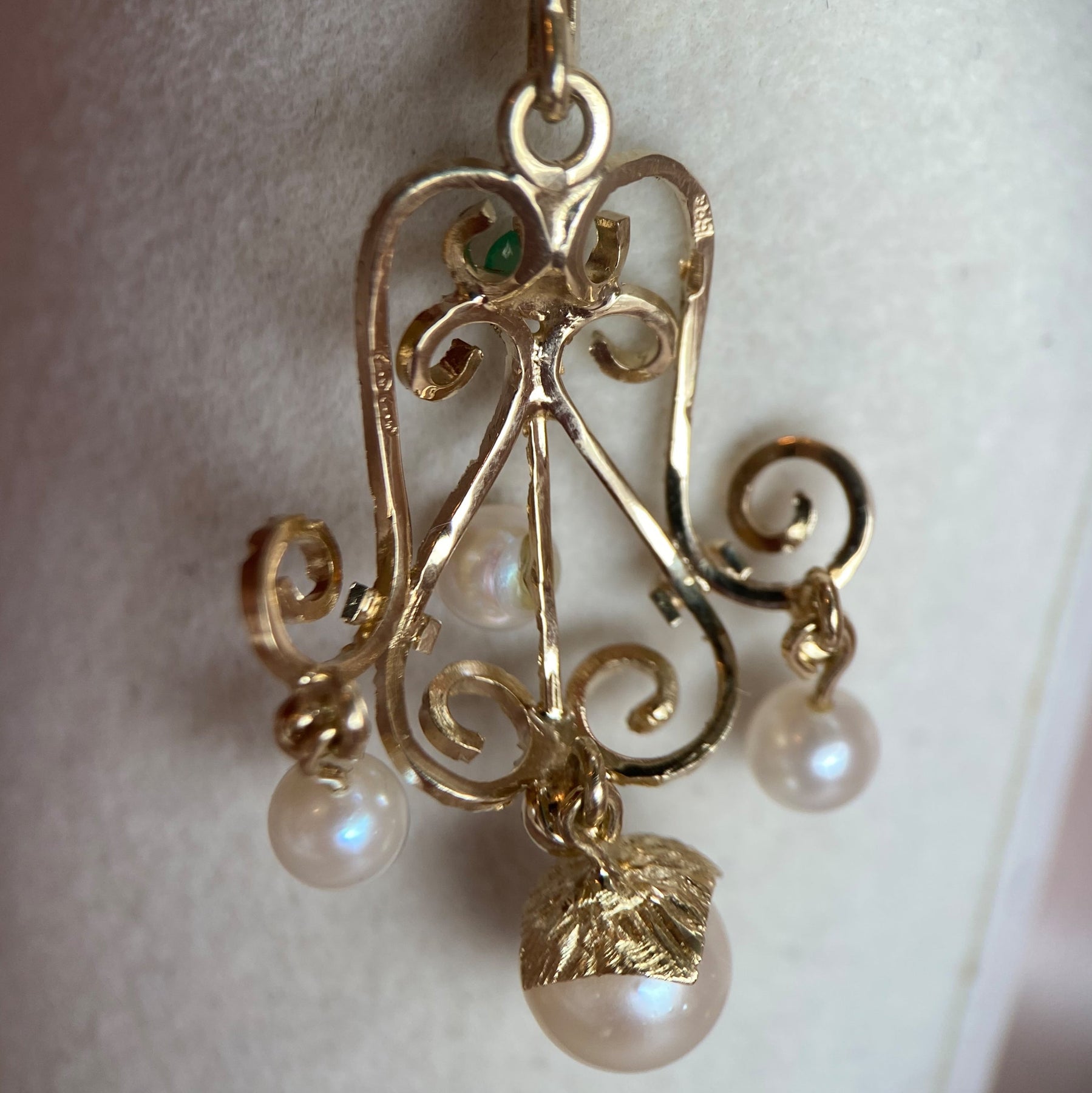 Dieses elegante Anhänger aus Gelbgold (585er Feingehalt) ist ein faszinierendes Schmuckstück aus der Zeit zwischen 1980 und 1995. Es trägt das österreichische Beschauzeichen (gültig 1925–2001), das seine Herkunft und Qualität bestätigt. Im Mittelpunkt des Designs liegt ein farbbehandelter grüner Chalcedon im Rundschliff, der von einer Zuchtperle mit einem Durchmesser von 7,5 mm sowie drei weiteren Zuchtperlen mit Durchmessern zwischen 4,5 und 4,8 mm umgeben ist. Die Kombination aus dem intensiven Grün des Chalcedons und dem zarten Glanz der Perlen verleiht dem Anhänger eine harmonische und zeitlose Schönheit. Das Gesamtgewicht des Anhängers beträgt 4,43 Gram mm. Dazu gehört eine Kette aus Gelbgold (585er Feingehalt) mit einem Gewicht von 3,63 Gramm, die ebenfalls das österreichische Beschauzeichen trägt. Der geschätzte Wert des Sets liegt bei etwa 1.700 Euro.