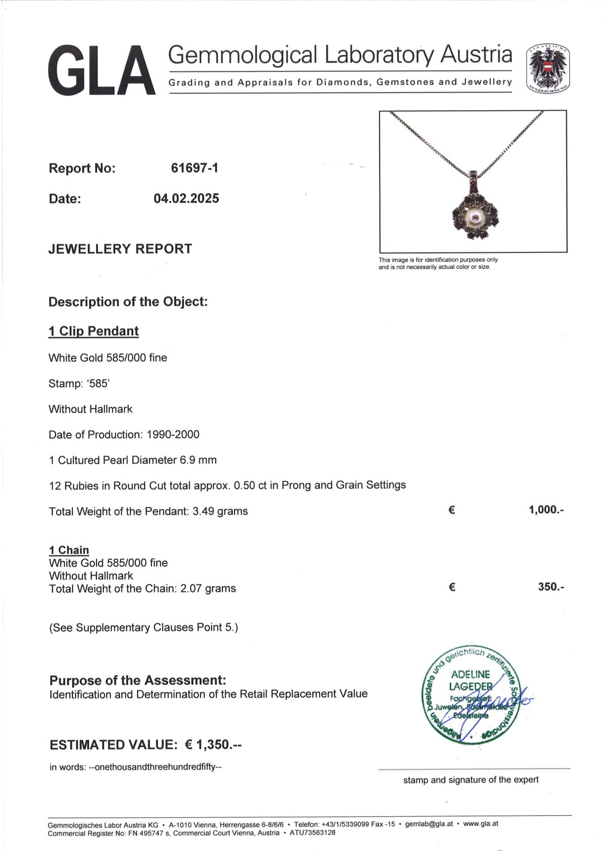 Dieses elegante Clip-Pendant aus Weißgold (585er Feingehalt) ist ein vielseitiges Schmuckstück aus der Zeit zwischen 1990 und 2000. Es trägt den Stempel „585“, der den Feingehalt des Materials bestätigt. Im Mittelpunkt des Designs liegt eine Zuchtperle mit einem Durchmesser von 6,9 mm, die von zwölf Rubinen im Rundschliff mit einem Gesamtgewicht von ca. 0,50 Karat umgeben ist. Die Rubine sind in einer Kombination aus Krappen- und Körnerfassungen eingearbeitet und verleihen dem Pendant einen intensiven Farbakzent. Das Gesamtgewicht des Pendants beträgt 3,49 Gramm. Dazu gehört eine Kette aus Weißgold (585er Feingehalt) mit einem Gewicht von 2,07 Gramm, die das Pendant perfekt ergänzt. Der geschätzte Wert des Sets liegt bei etwa 1.350 Euro.