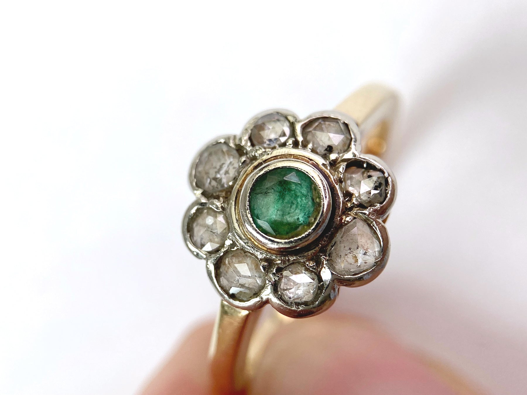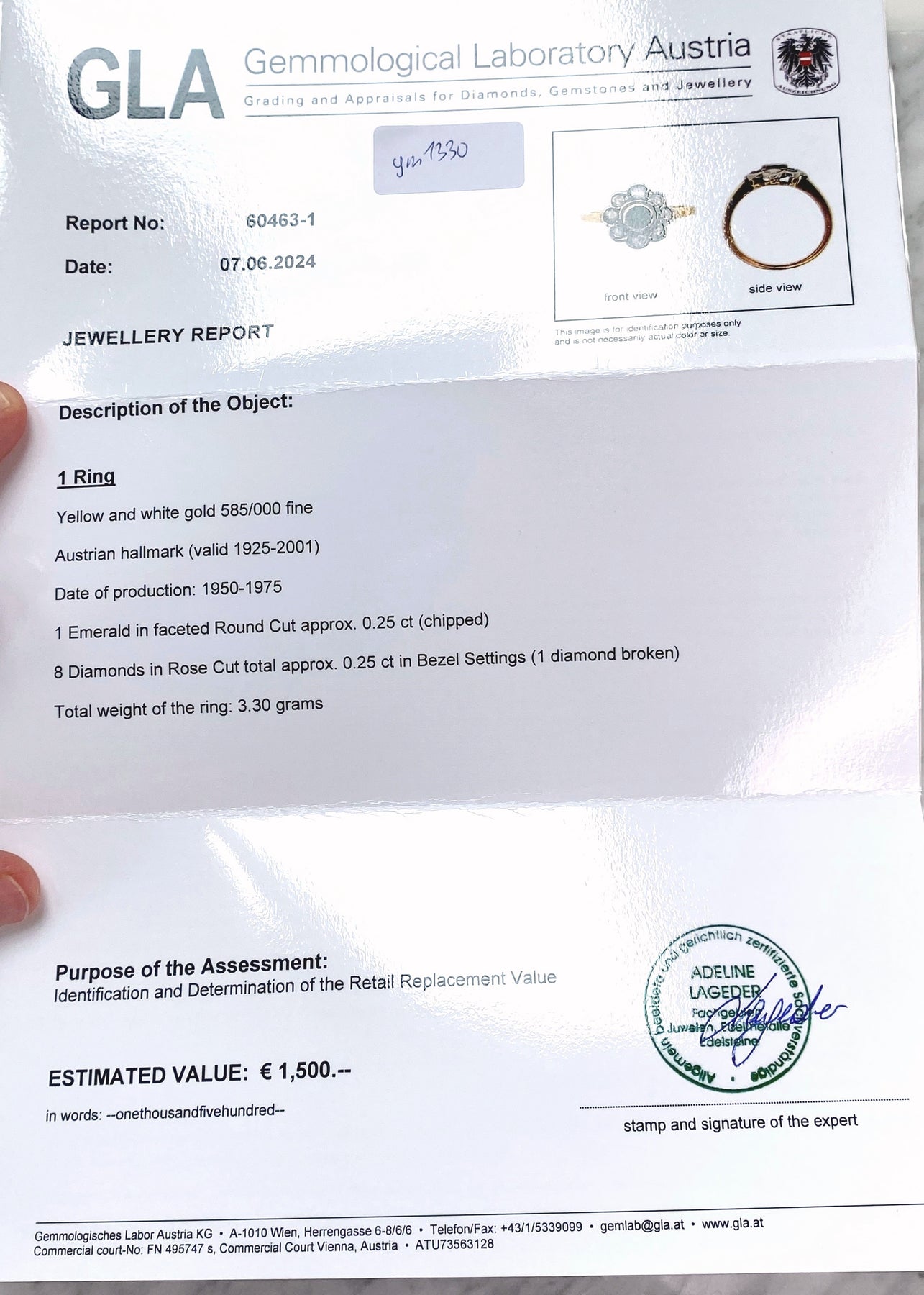 Dieser charmante Ring aus 585er Gelb- und Weißgold trägt die österreichische Meistermarke (gültig 1925-2001) und wurde zwischen 1950 und 1975 gefertigt. Der Ring ist mit einem facettierten runden Smaragd von ca. 0,25 ct besetzt, der in einer eleganten Fassung sitzt, jedoch kleine Absplitterungen aufweist. Umrahmt wird der Smaragd von 8 Diamanten im Rosenschliff, die zusammen ca. 0,25 ct wie kleine funkelnde Akzente in Zargenfassungen zieren. Leider ist ein Diamant beschädigt. Das Gesamtgewicht des Rings beträgt 3,30 Gramm.