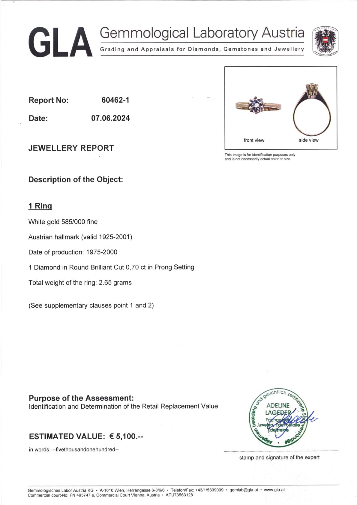 Im Mittelpunkt des Designs steht ein funkelnder Diamant im Rundbrillantschliff mit einem Gewicht von 0,70 Karat. Der Diamant besticht durch einen hohen Farbgrad und eine außergewöhnlich hohe Reinheit. Sein moderner Schliff sorgt für eine brillante Lichtreflexion und verleiht dem Ring eine unvergleichliche Strahlkraft. Der Stein ist in einer klassischen Krappenfassung eingefasst, die seine Schönheit betont und gleichzeitig für sicheren Halt sorgt.