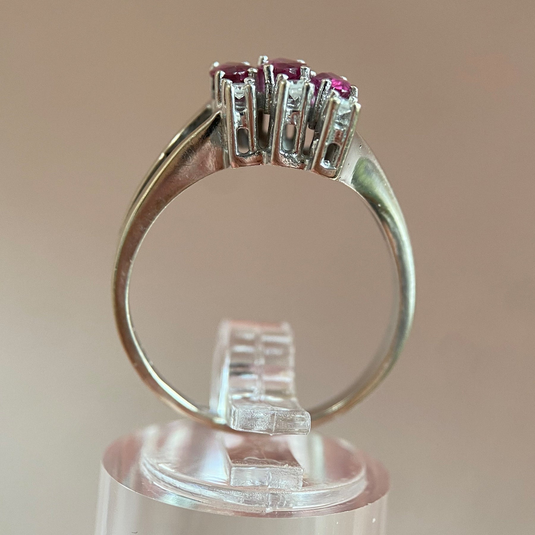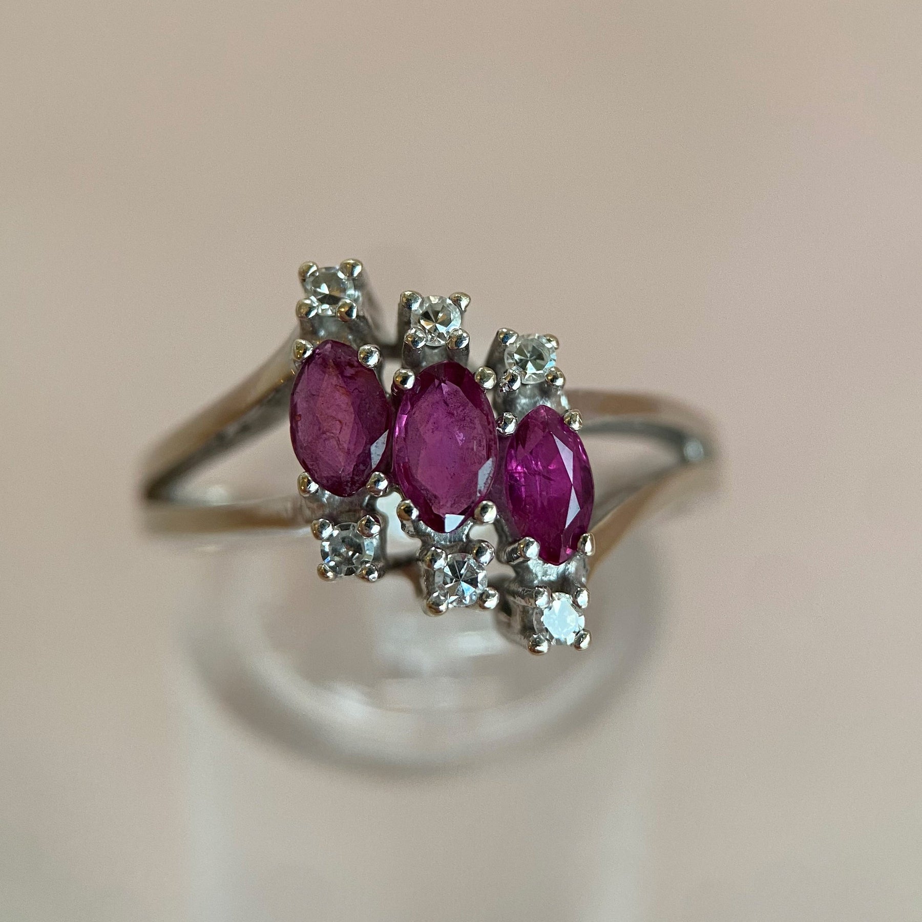 eißgoldener Ring 585 aus dem späten 20. Jahrhundert mit drei rubinroten Rubinen im Marquise‑Schliff und sechs funkelnden Achtkant‑Diamanten in Krappenfassungen, elegantes „Pinkes Wunder“‑Design