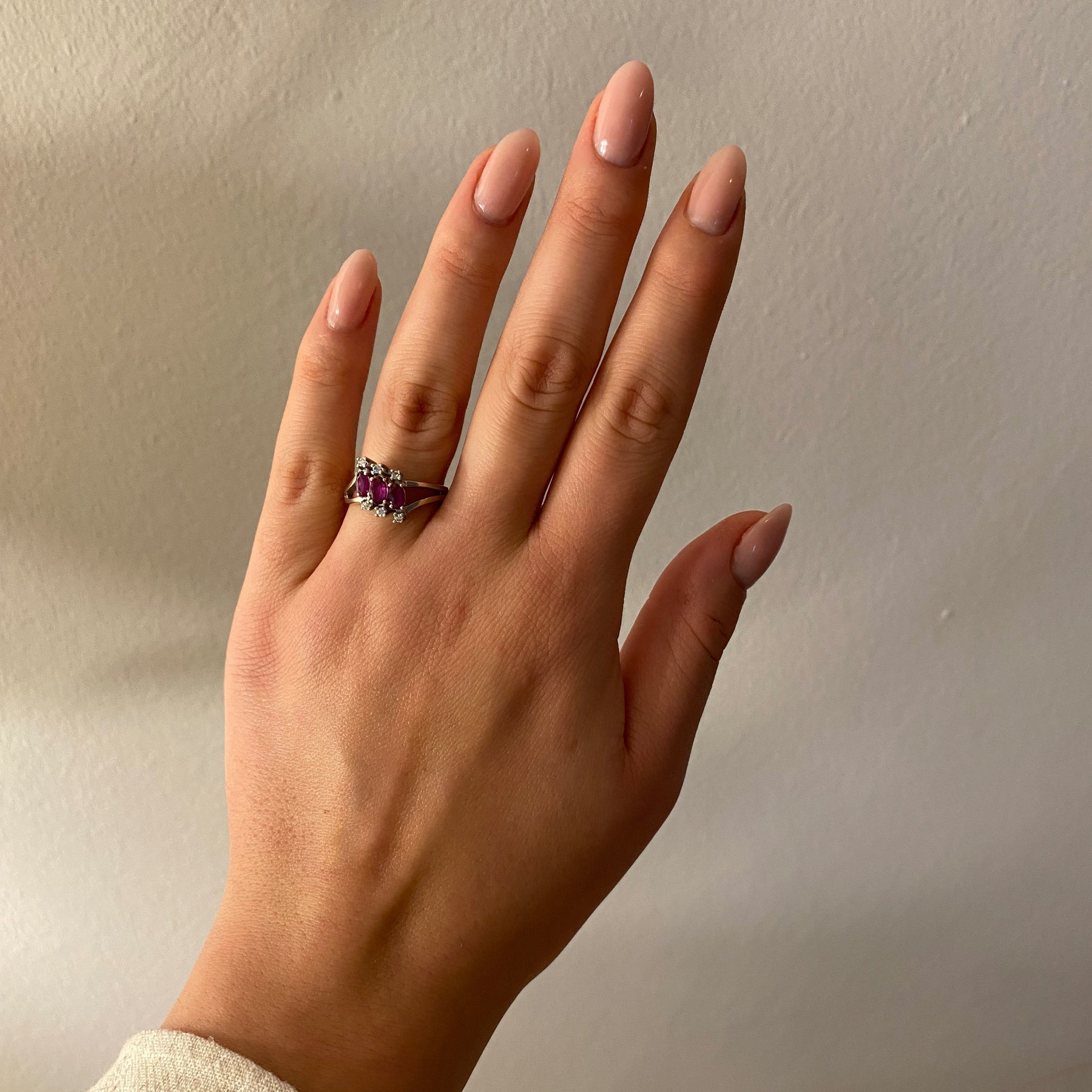 Tragefoto: Weißgold‑Rubin‑Diamant‑Ring am Finger getragen, zeigt Größe, Proportion und elegante Wirkung