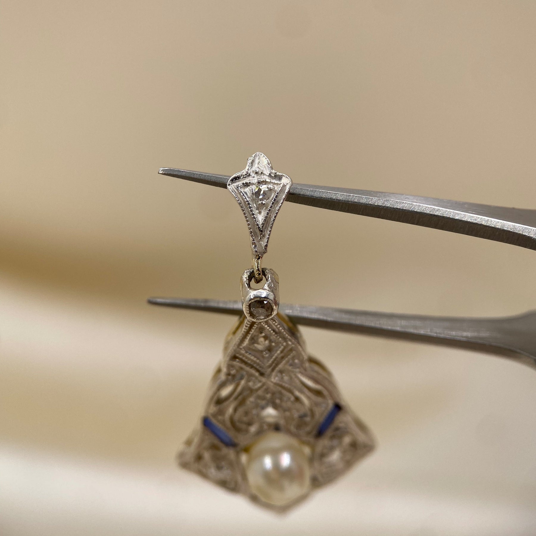 This elegant pendant, crafted from 585 yellow gold with components in 9925 silver, dates back to the Art Deco era and was made between 1920 and 1940. It is a beautiful example of the craftsmanship of this period, known for its clean lines and elegant designs. The pendant features a cultured saltwater pearl with a diameter of 5.4 mm, set in a sophisticated design. Two synthetic blue baguette-cut sapphires add a vibrant color contrast to the piece. Additionally, an old European-cut diamond (approx. 0.003 ct) is set in a bezel setting, as are six rose-cut diamonds (totaling approx. 0.10 ct) in grain settings.