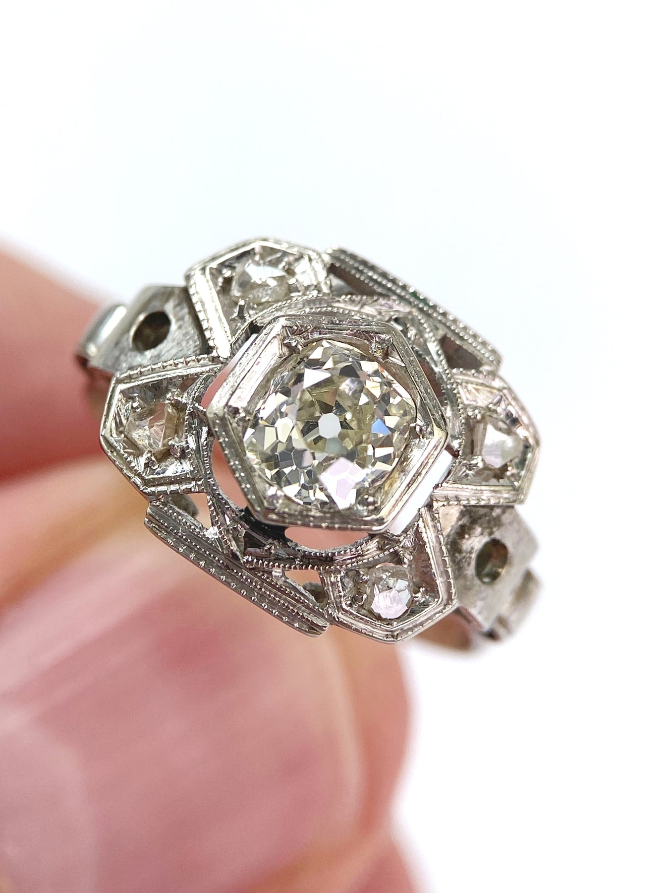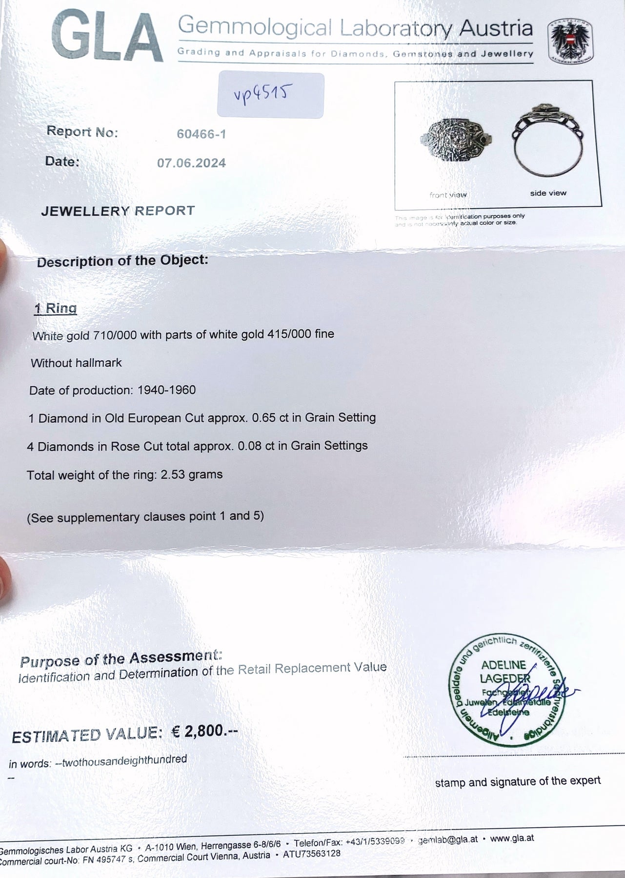 At the center of the ring sits an Old European-cut diamond weighing approximately 0.65 carats. This main stone, known for its characteristic "chunky" luster, is surrounded by four smaller rose-cut diamonds. All stones are set in bead settings, giving the ring a delicate yet robust appearance.