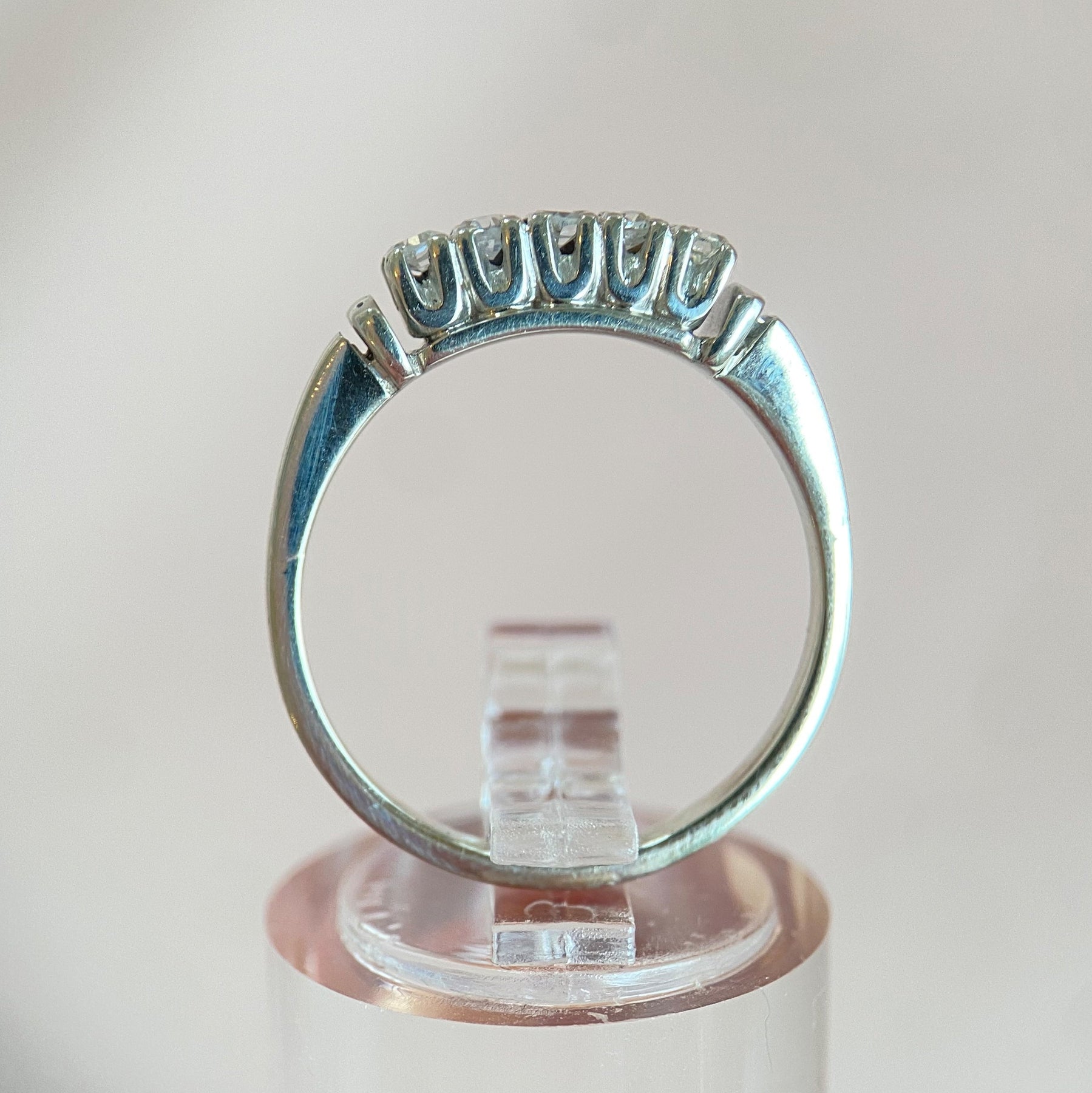 Vintage-Ring aus 585er Weißgold mit fünf Diamanten im Achtkantschliff in klassischen Krappenfassungen.