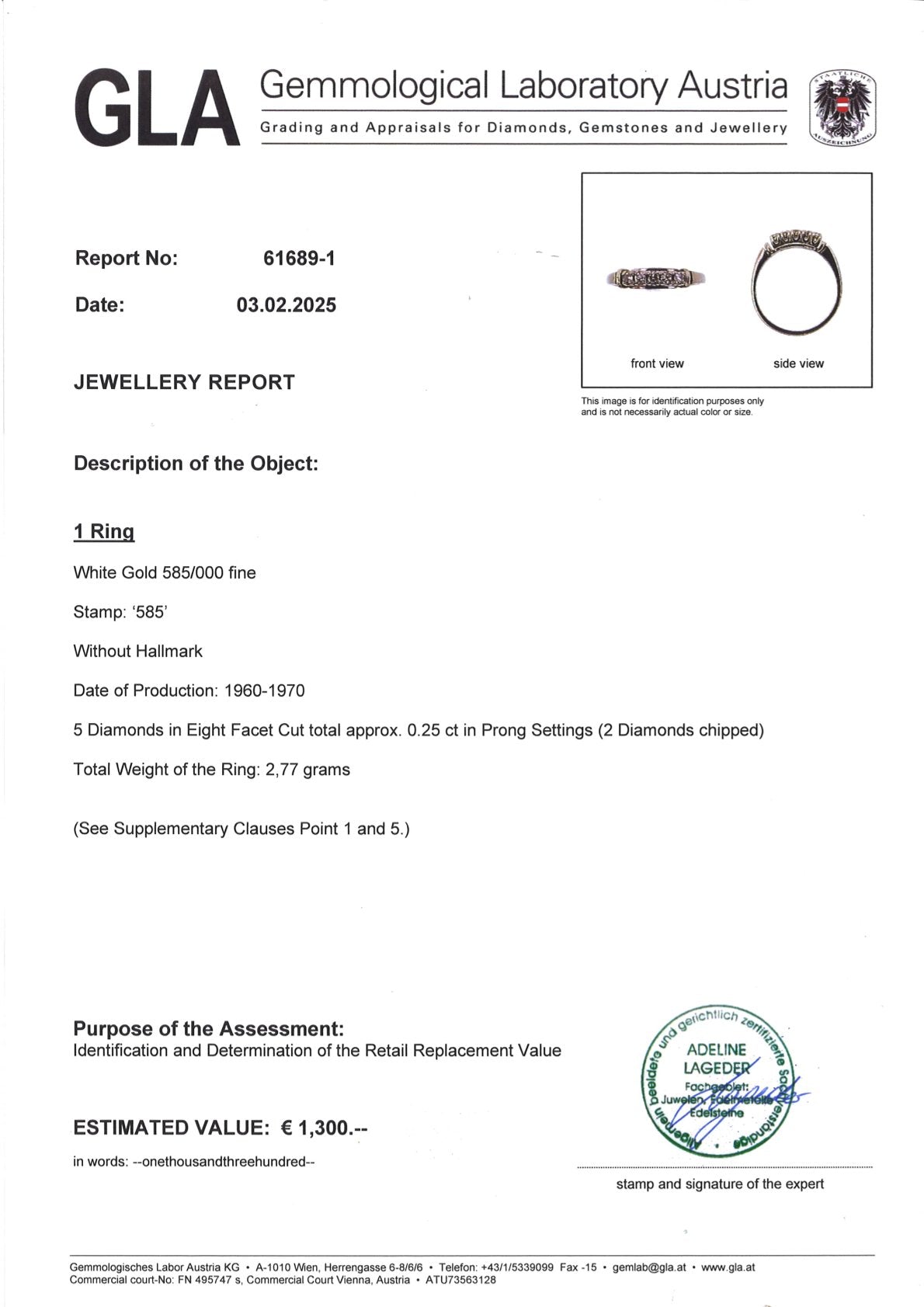 Ring S013 aus 585er Weißgold mit Diamanten, Ansicht der GLA-Zertifikatsunterlagen, Echtheits- und Wertbescheinigung, Detailaufnahme Schmuck und Gutachten