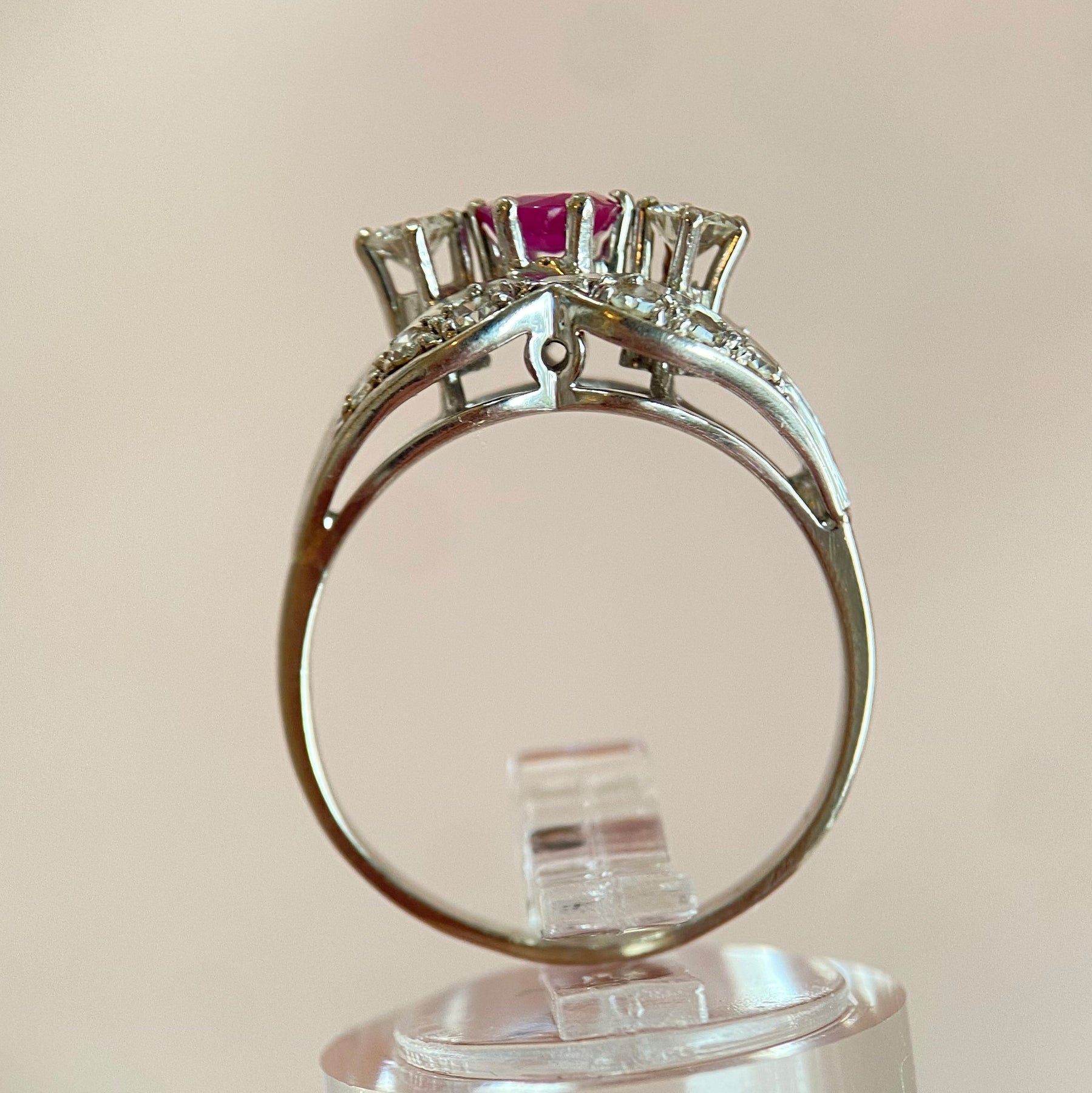 At the center of the ring is a Round-cut ruby weighing approximately 0.35 carats, captured in a classic prongsThe gemological characteristics of this stone correspond to those natural rubies from Burma, which are known for their characteristic color intensity and prized origin. The ruby lends the ring a warm, vibrant presence.