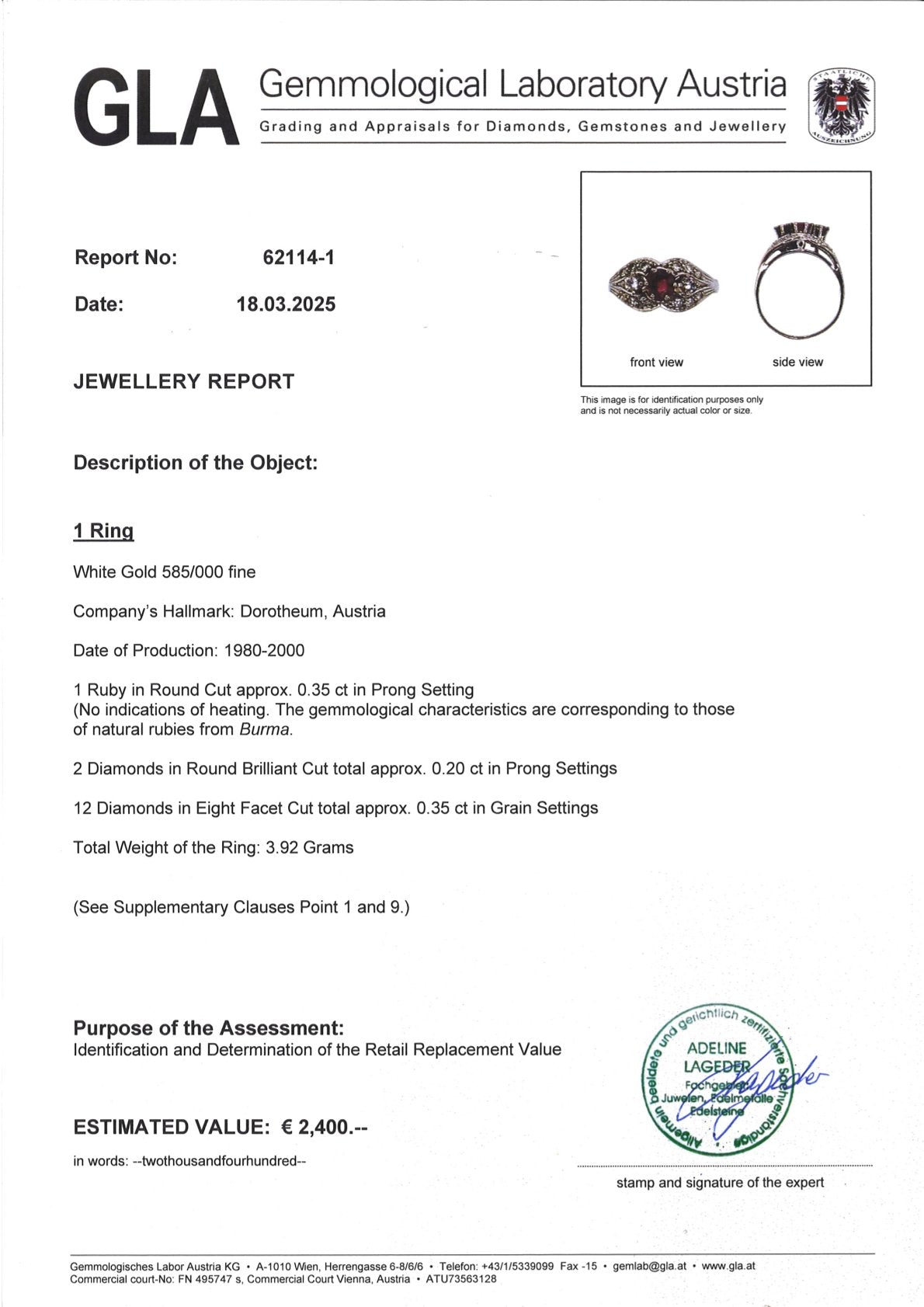 Estimated value according to appraisal: 2,400 euros