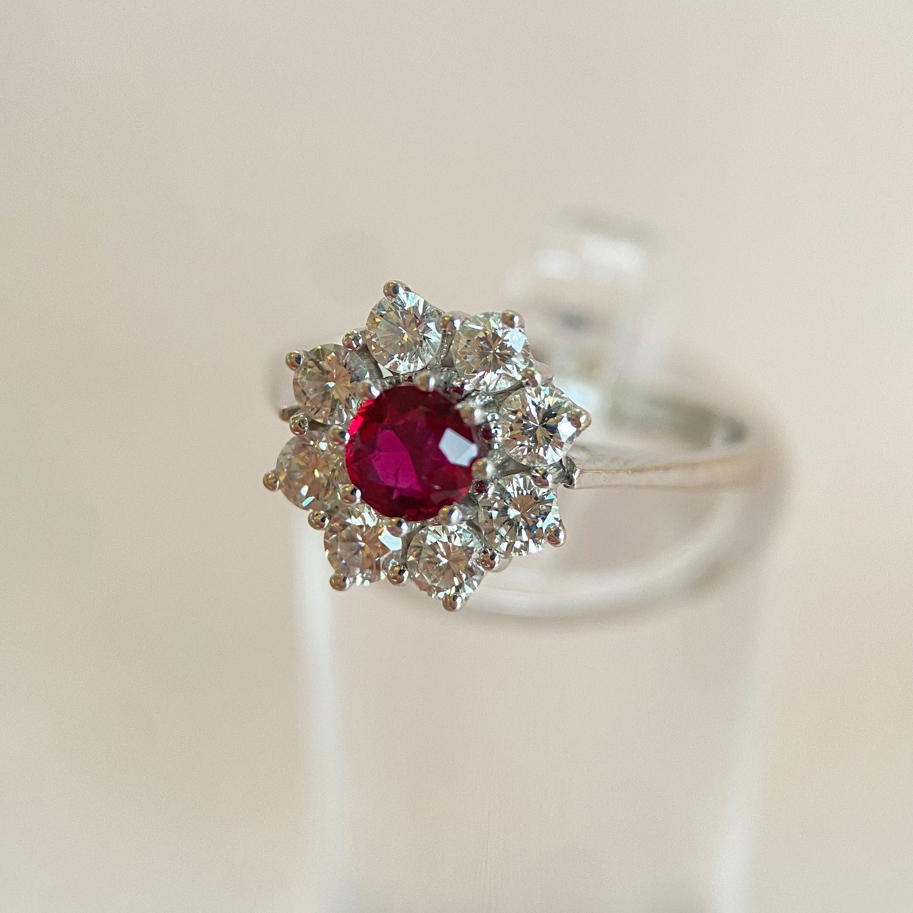 Nahaufnahme der acht Diamanten im Rund‑ und Brillantschliff um den Rubin, präzise Krappenfassungen und Lichtreflexe sichtbar