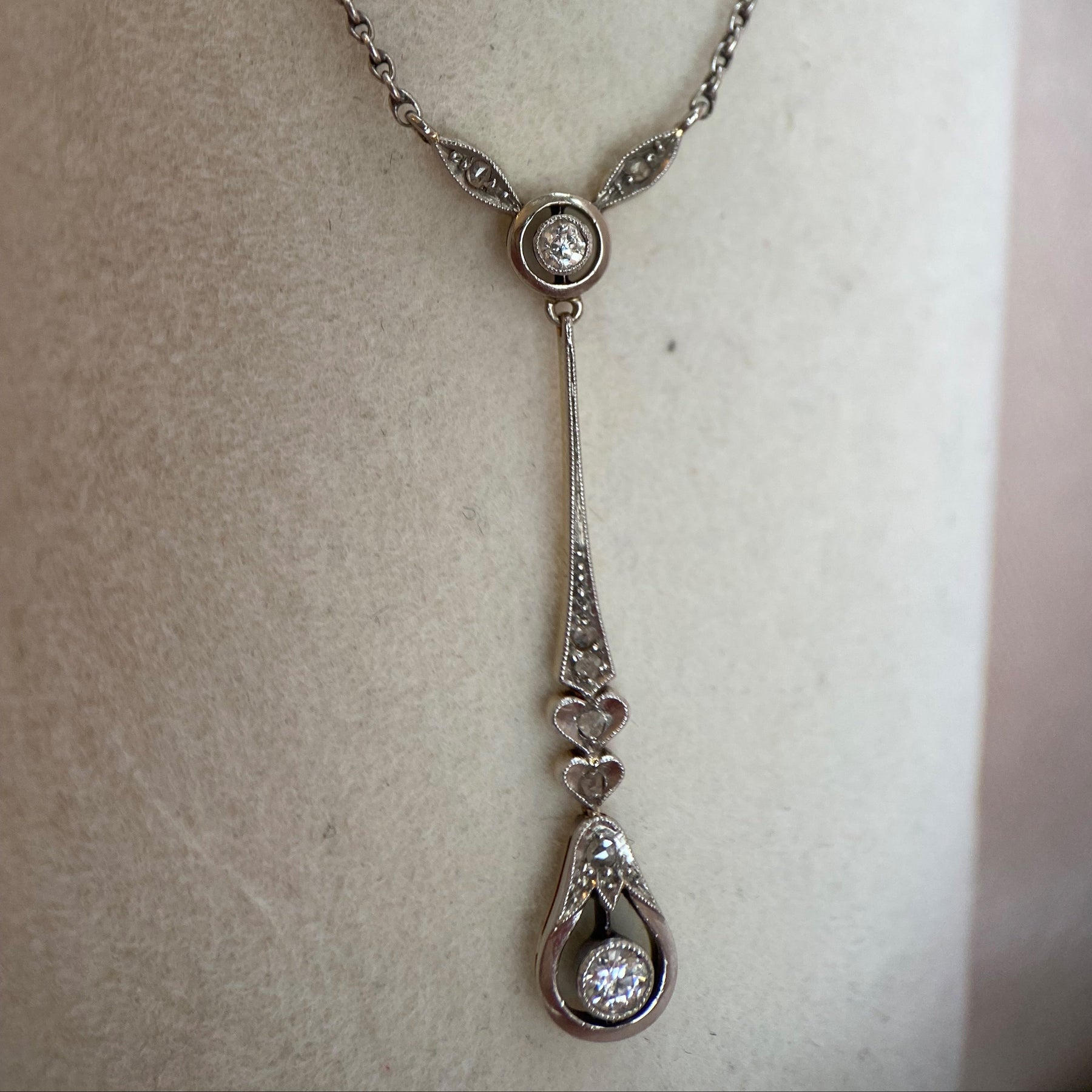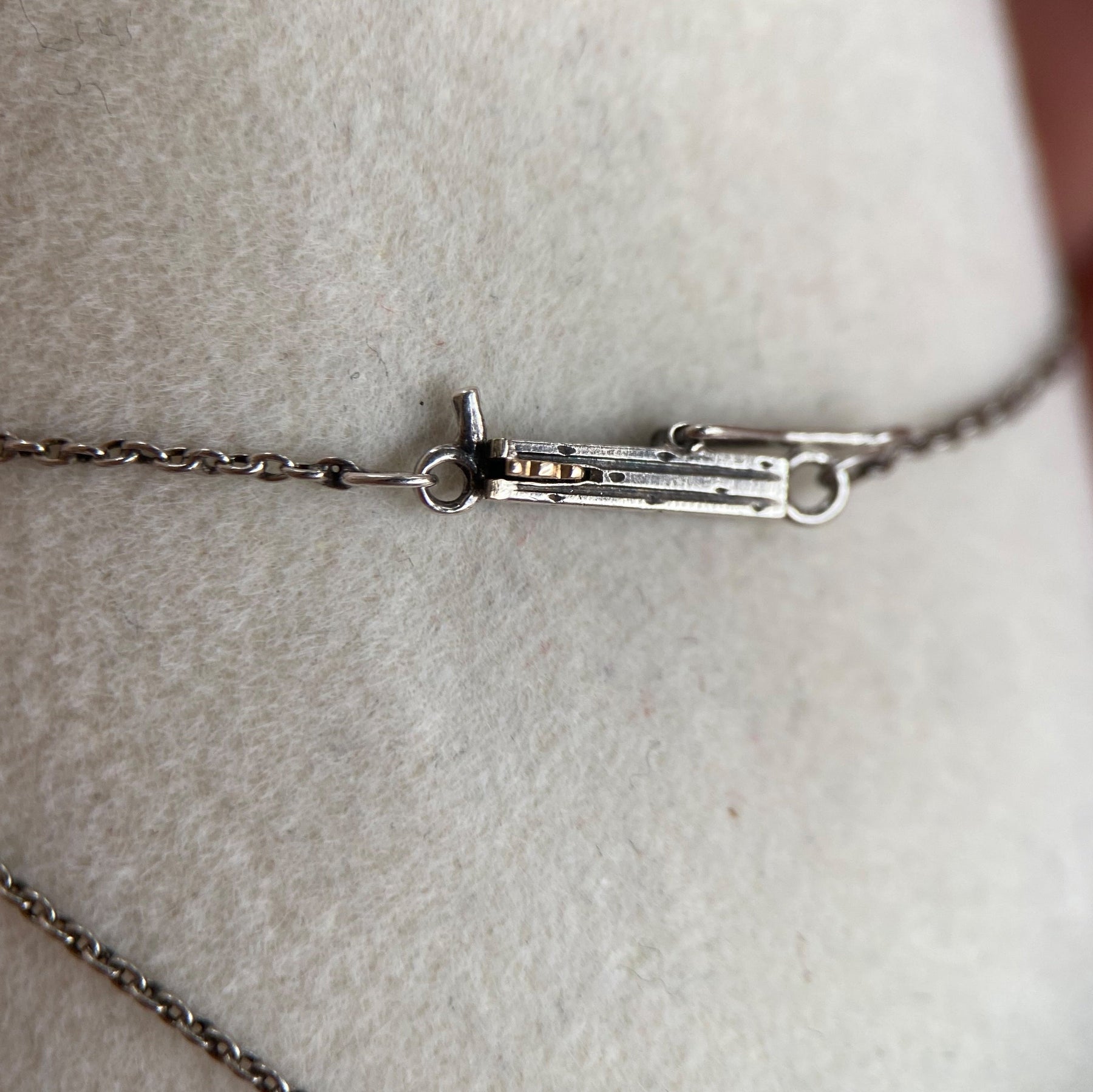 The diamonds show a high colour grade (E–G) as well as a Medium purity (SI). Its aged finish gives the necklace a subtle depth and a quiet elegance that is particularly appreciated by connoisseurs of antique jewelry.