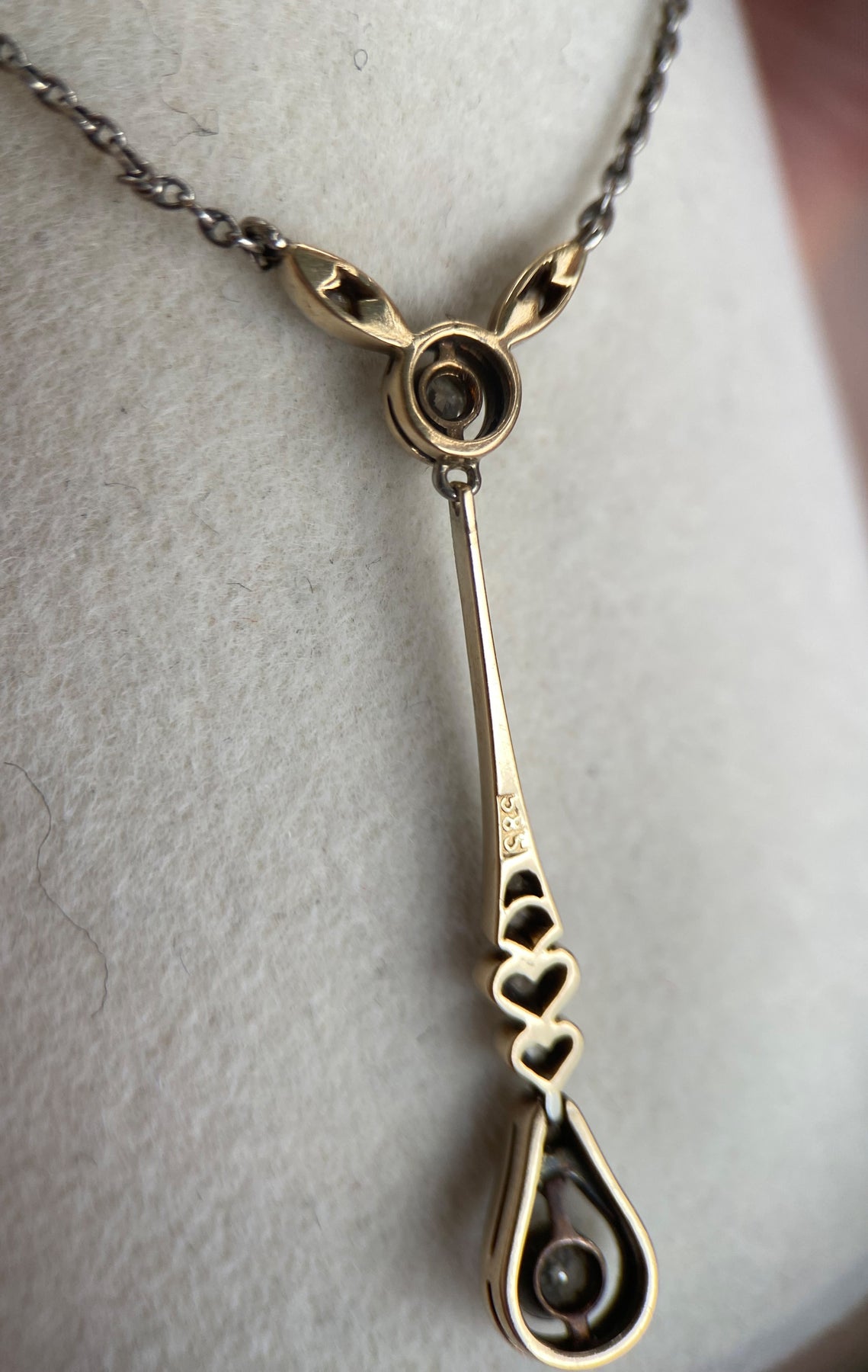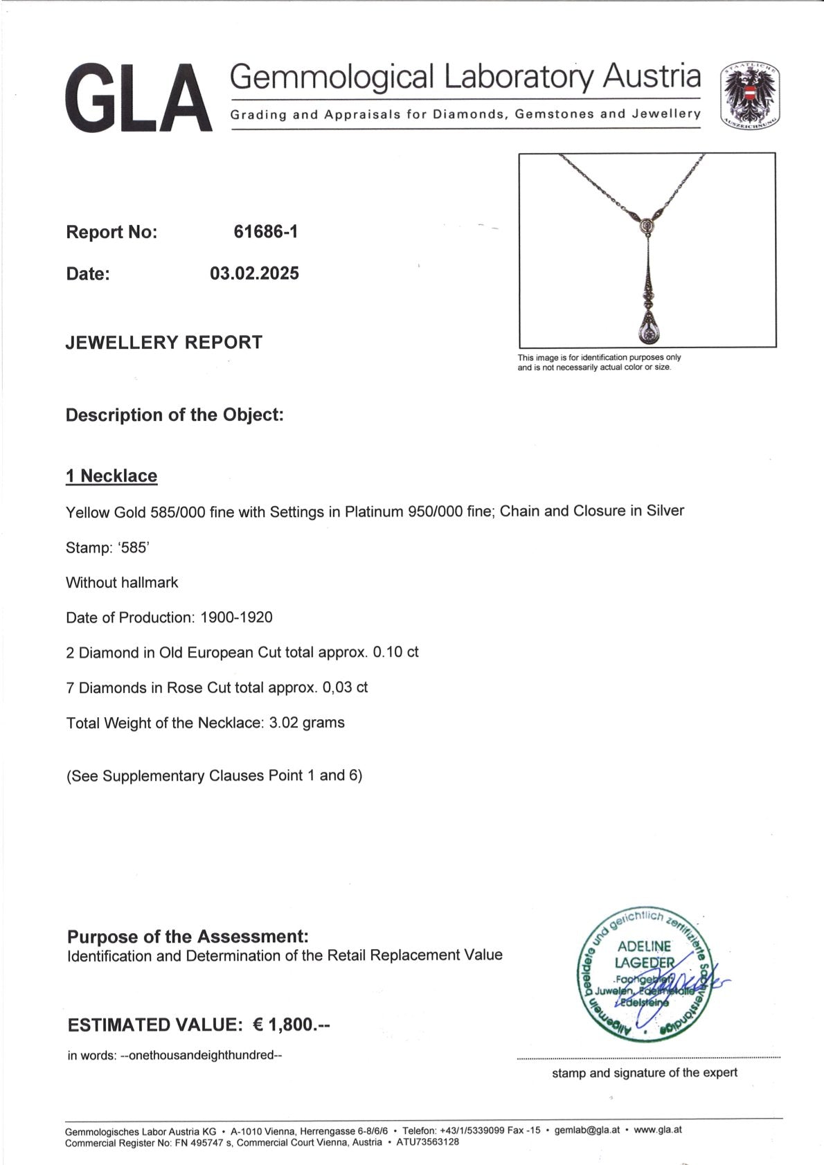 This fine Necklace made of 585 yellow gold (14 karat) with Platinum 950 settings and one Chain and clasp made of silver dates from that time between 1900 and 1920The combination of materials is typical of the early transition from Art Nouveau to the classic elegance of the early 20th century and lends the piece of jewelry a special refinement. Stamp "585" confirms the gold content.
