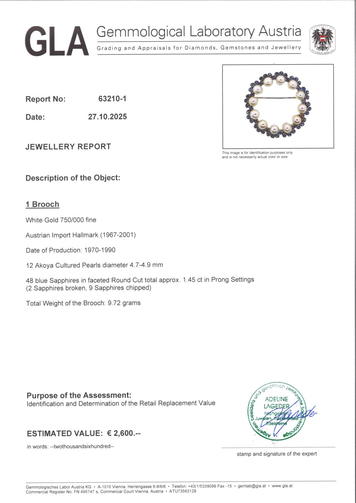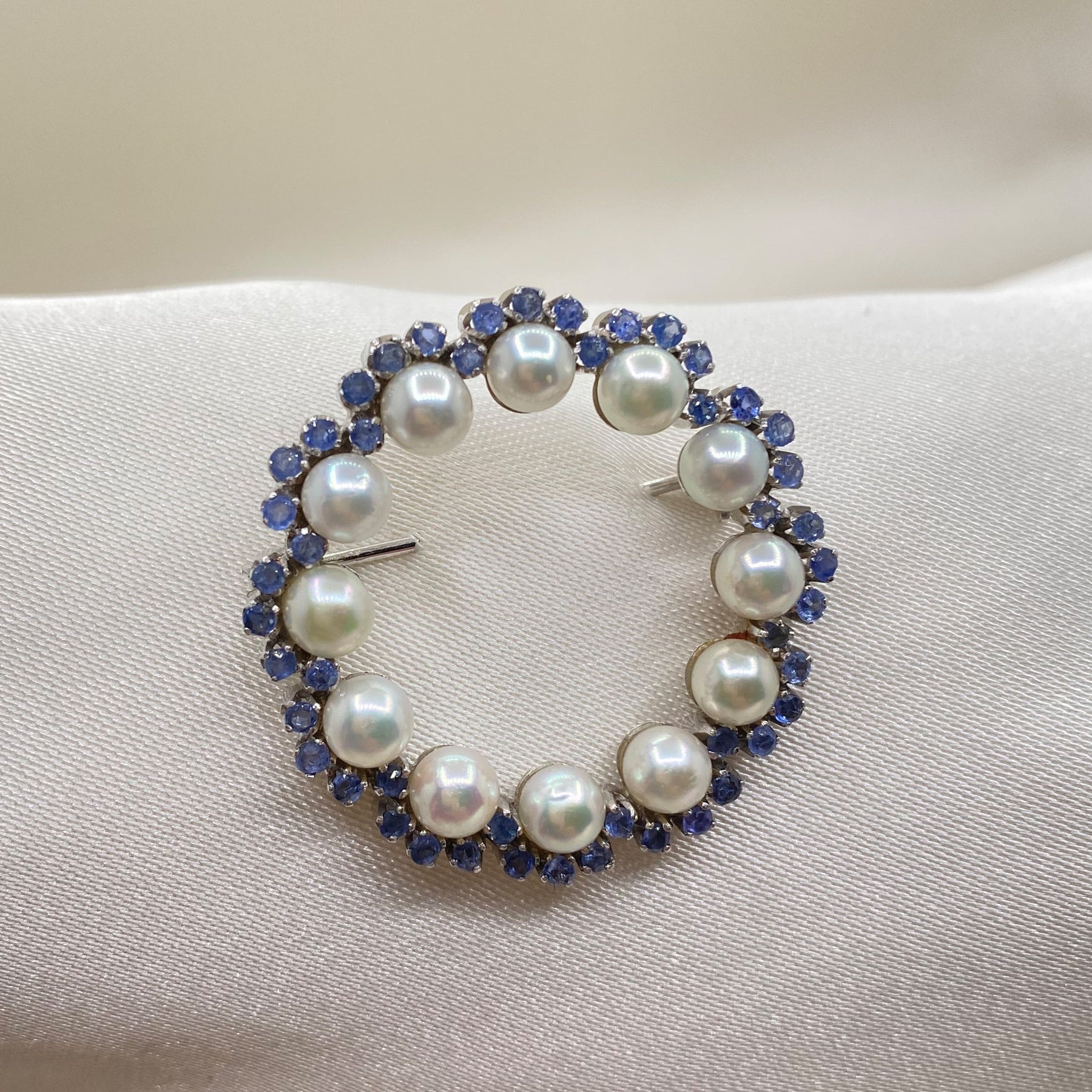 The design focuses on twelve fine Akoya cultured pearls with a diameter of approximately 4.7 to 4.9 mm, which radiate an elegant tranquility through their soft luster. They are framed by 48 faceted, round-cut blue sapphires, which add vibrant color accents and give the brooch depth and texture. The stones are in classic styles. prong fittings framed, which makes their color and sparkle stand out particularly well.