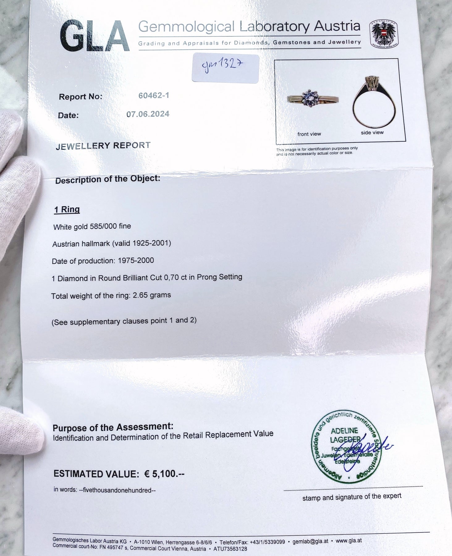 • Main stone: Diamond, round brilliant cut, approx. 0.70 ct