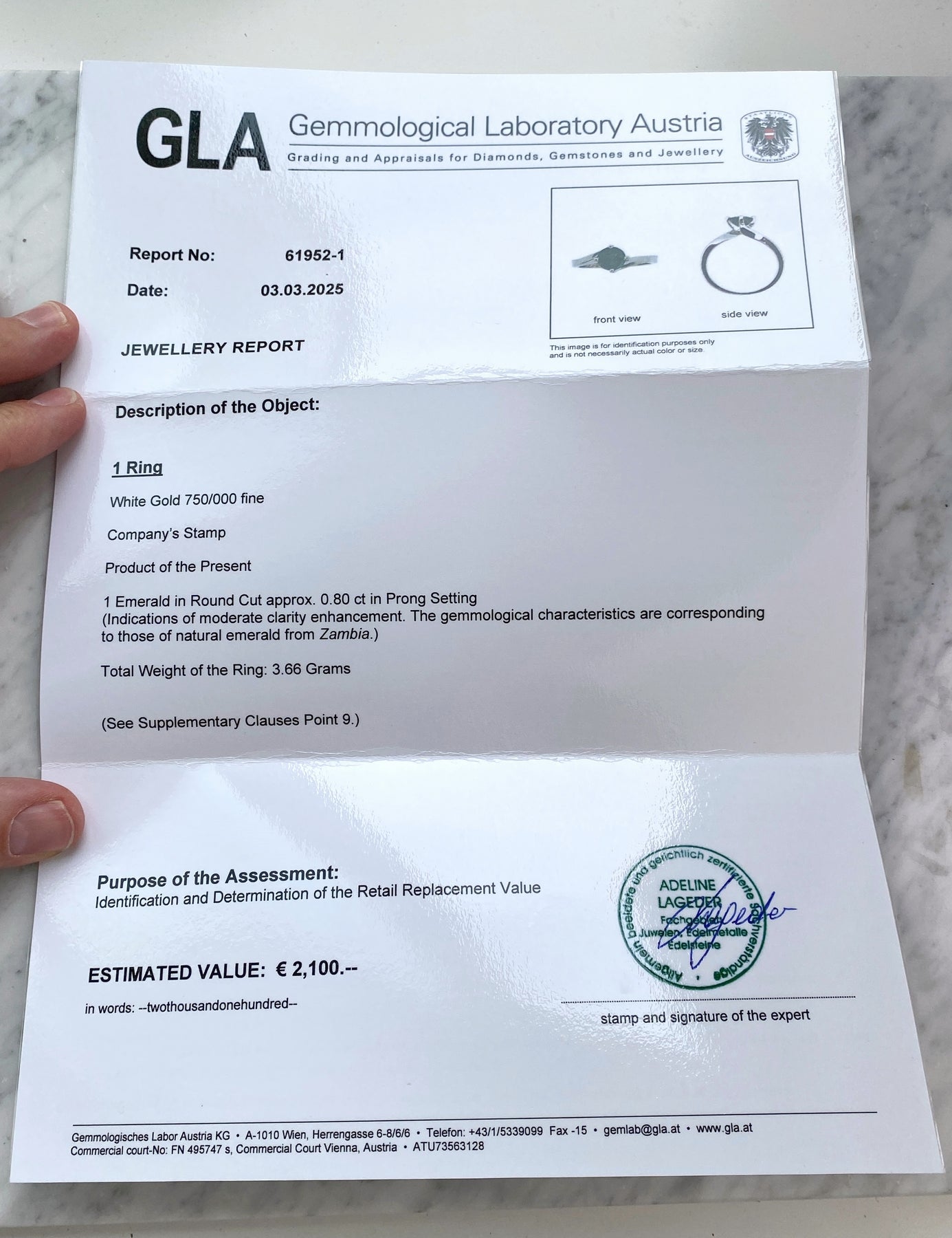 This modern 18k white gold ring is a contemporary piece of jewelry of the utmost elegance. It bears the manufacturer's hallmark and was crafted in the present day. The centerpiece of the ring is a natural round-cut emerald weighing approximately 0.80 carats, set in a prong setting. The emerald originates from Zambia and displays moderate clarity enhancement, highlighting its natural beauty. With a total weight of 3.66 grams and a ring size of 53, this ring is a perfect accessory for special occasions. The estimated value is approximately €2,100.