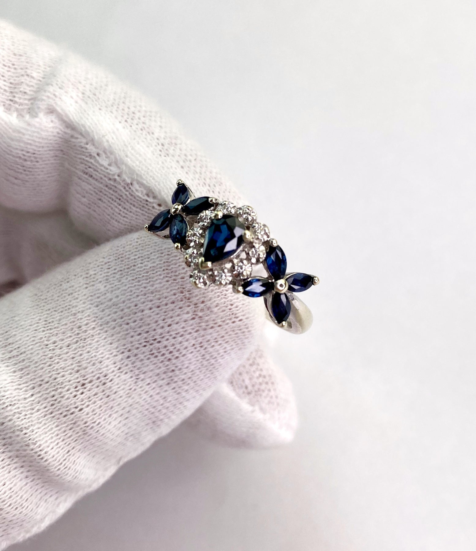 At the center of the ring is a dark blue, faceted, pear-cut sapphire weighing approximately 0.40 carats, set in a prong setting. This setting highlights the gemstone and allows it to sparkle by maximizing the light. The main stone is complemented by eight dark blue, faceted, marquise-cut sapphires weighing a total of approximately 0.55 carats, also set in prong settings. The marquise cut gives the stones an elegant, elongated shape with pointed ends, lending the design a dynamic and sophisticated appearance.