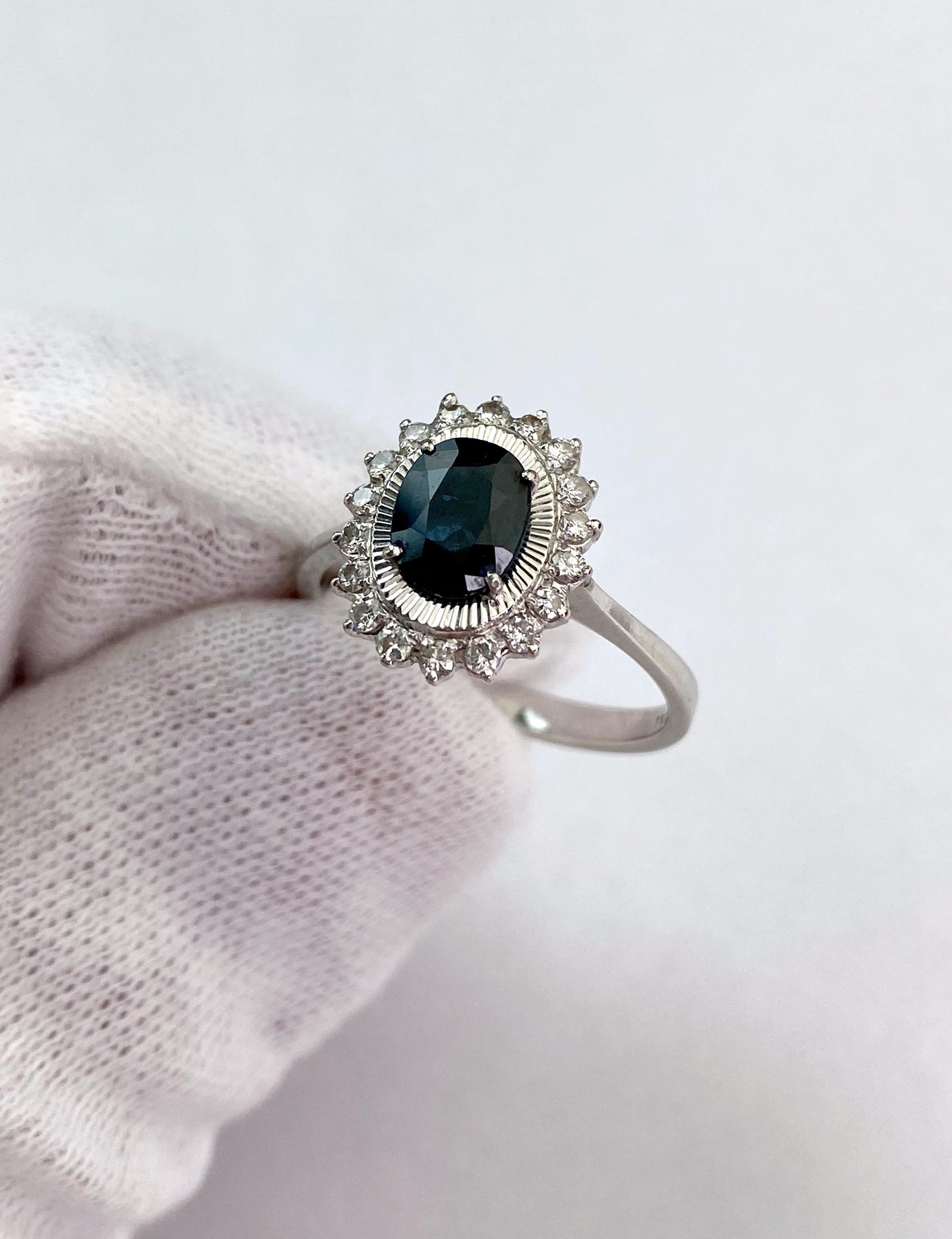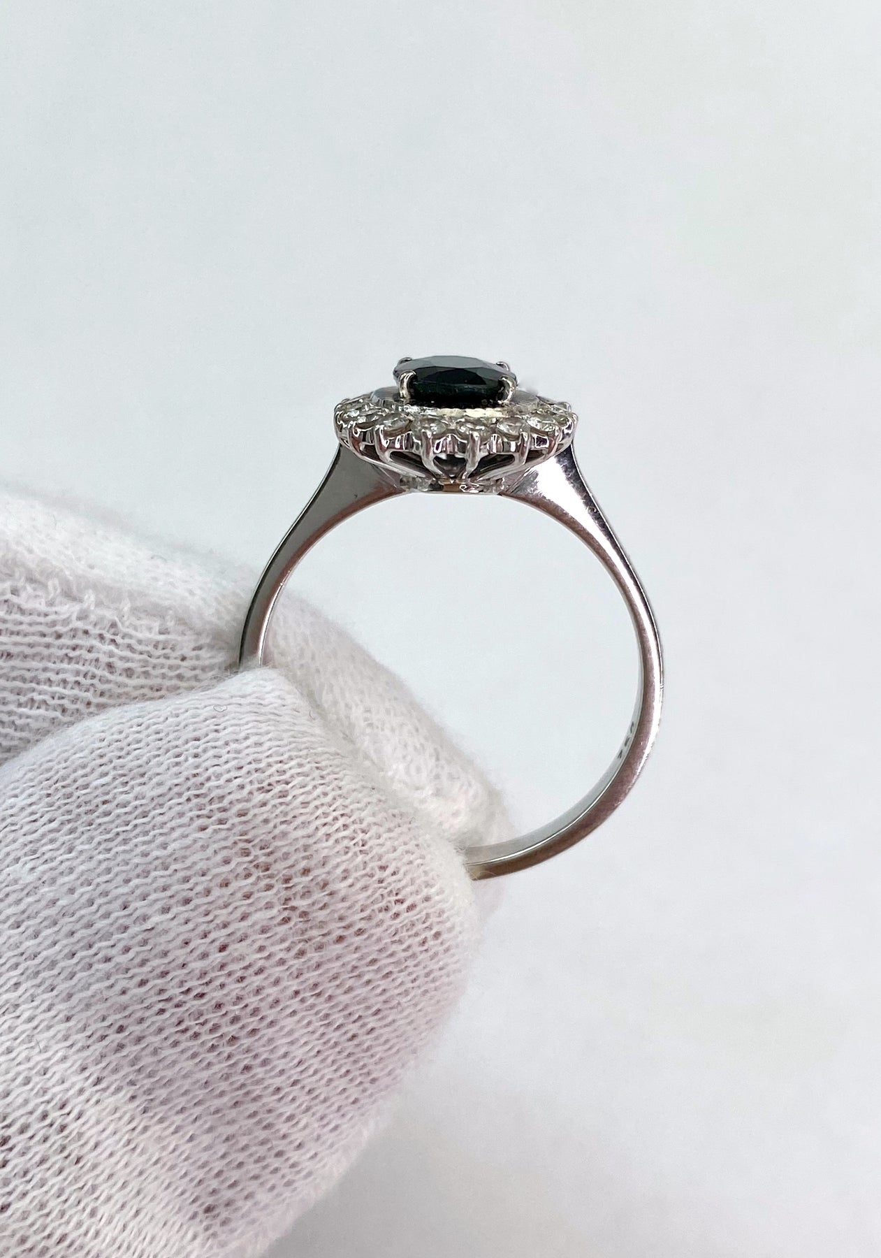 This ring combines the elegance of a dark blue sapphire with the fire of diamonds and the timeless beauty of white gold. It perfectly represents the jewelry style of the early 21st century, characterized by clean lines, high-quality materials, and an emphasis on individual aesthetics.