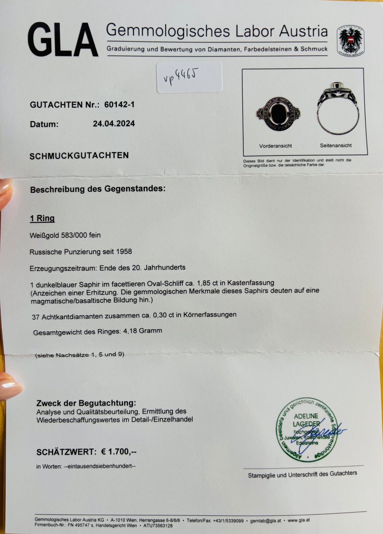 - Main stone: Dark blue sapphire, oval cut, approx. 1.85 ct (signs of heating)