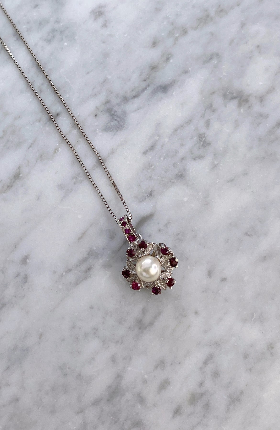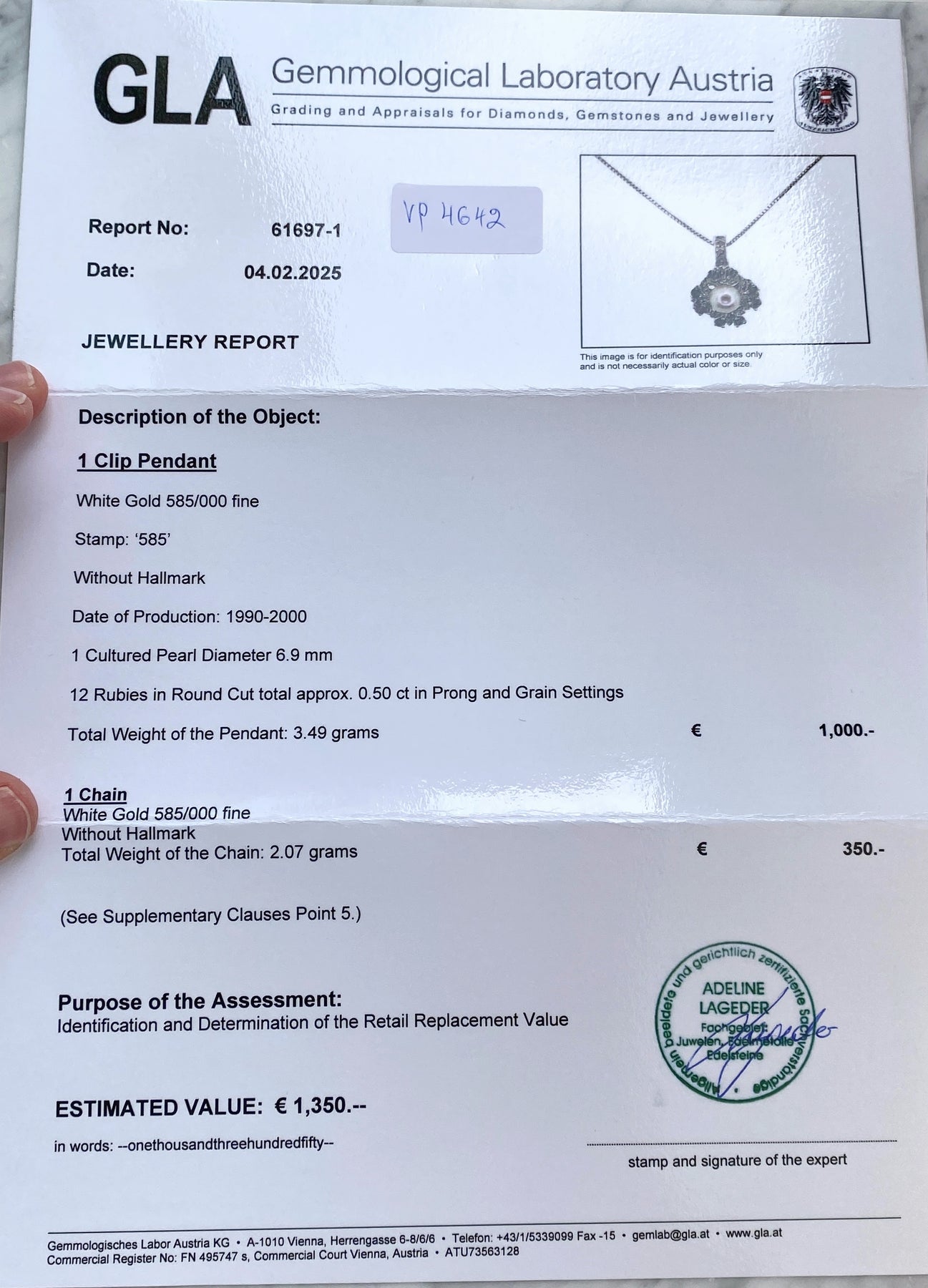 This elegant clip-on pendant made of white gold (585 fineness) is a versatile piece of jewelry from the period between 1990 and 2000. It bears the "585" hallmark, confirming the fineness of the material. The design centers on a 6.9 mm diameter cultured pearl surrounded by twelve round-cut rubies with a total weight of approximately 0.50 carats. The rubies are set in a combination of prong and bead settings, lending the pendant an intense color accent. The total weight of the pendant is 3.49 grams. It includes a 2.07 gram white gold chain (585 fineness), which perfectly complements the pendant. The estimated value of the set is approximately €1,350.