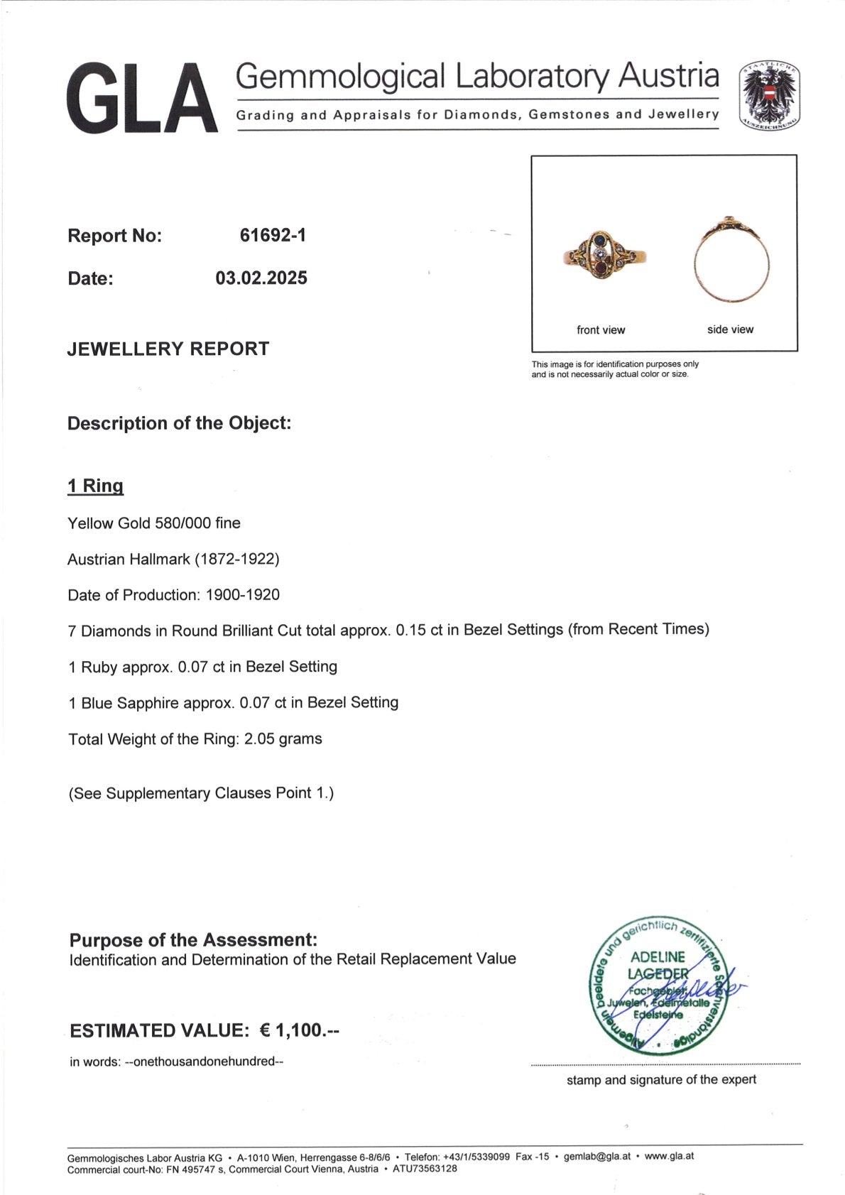 The ring's design is characterized by a harmonious combination of gemstones: seven brilliant-cut diamonds, a vibrant red ruby, and a deep blue sapphire are set in classic bezel settings. The diamonds impress with their high color and brilliance, while the ruby and sapphire add color accents and lend the ring a special charisma. The stone settings are recent, lending the piece a touch of modernity without losing its historic charm.