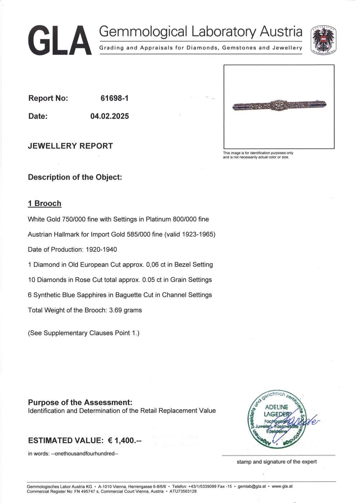 Diese edle Brosche aus 750er Weißgold, kombiniert mit Fassungen aus 800er Platin, besticht durch ihre klassische Eleganz und Handwerkskunst. Die Brosche trägt das österreichische Importstempel für 585er Gold (gültig 1923-1965) und wurde zwischen 1920 und 1940 gefertigt. Sie ist mit einem Diamanten im alten europäischen Schliff (ca. 0,006 ct) in Zargenfassung sowie 10 Diamanten im Rosenschliff (insgesamt ca. 0,05 ct) in Grain Settings verziert. Weitere Highlights sind 6 synthetische blaue Saphire im Baguetteschliff, die in Kanalsettings eingefasst sind. Mit einem Gesamtgewicht von 3,69 Gramm ist diese Brosche ein wahres Meisterwerk der Schmuckkunst aus der Zeit des frühen 20. Jahrhunderts.