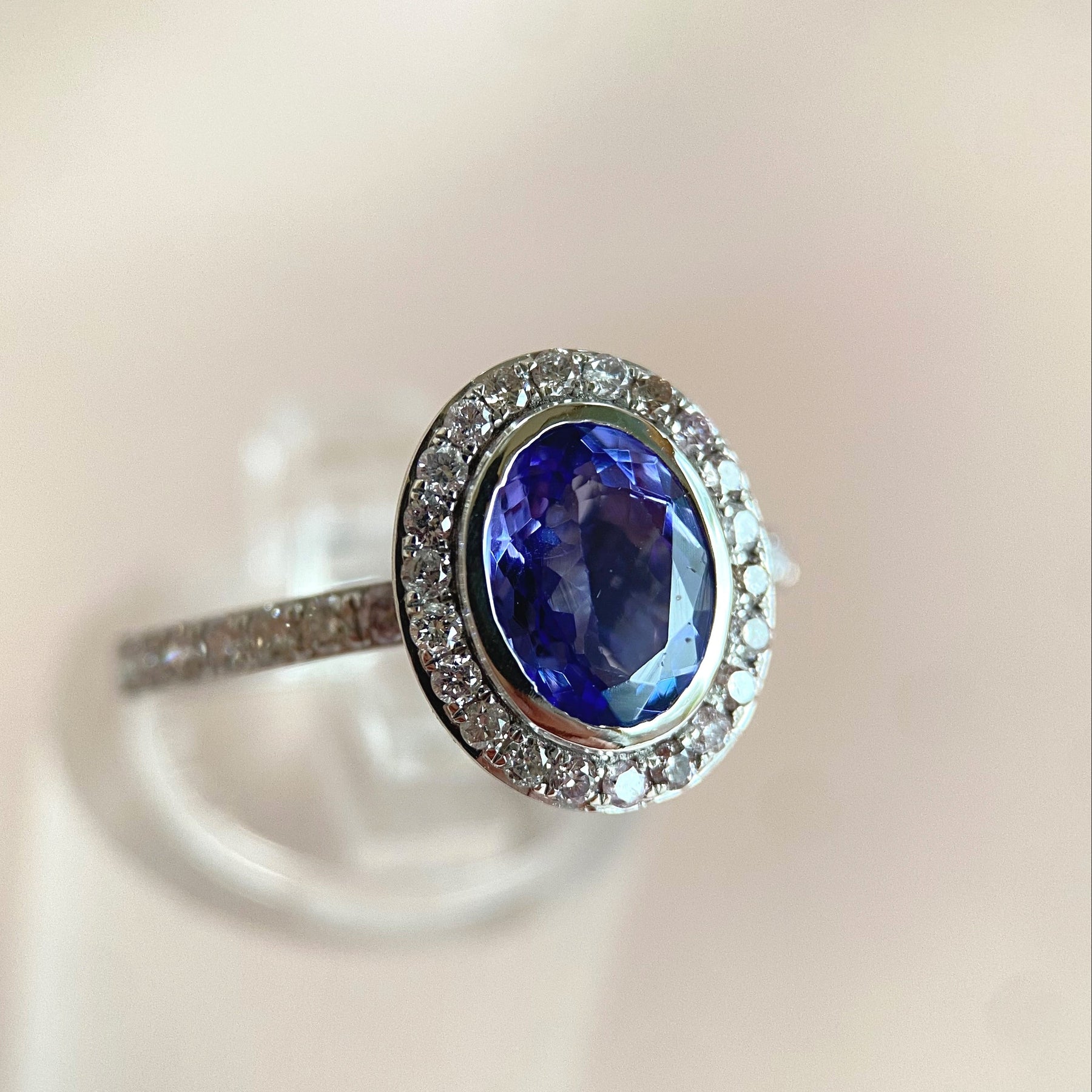 Detailaufnahme des intensiv blau‑violetten ovalen Tanzanits im Weißgoldring, kräftige Farbwirkung und präzise Krappenfassung